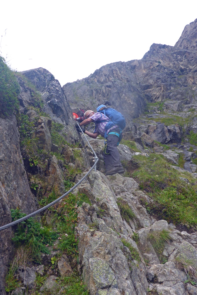 Auf dem Weg sind einige Passagen seilversichert. Kurz vor dem Steinkogel muss man durch die felsigen Steilrinnen. Sie sind zwar mit Drahtseilen gesichert, setzen aber absolute Trittsicherheit und Schwindelfreiheit. Teilweise steil und sehr ausgesetzt. An dieser Schlüsselstelle sollten unerfahrene ein Klettersteigset anlegen! Aufgrund eines Steinschlags ist der Cottbuser Weg am Ende gesperrt. So mussten wir noch einmal 300hm absteigen um sie gleich wieder aufzusteigen. Der restliche Weg zur Hütte ist dann weiter bergauf.