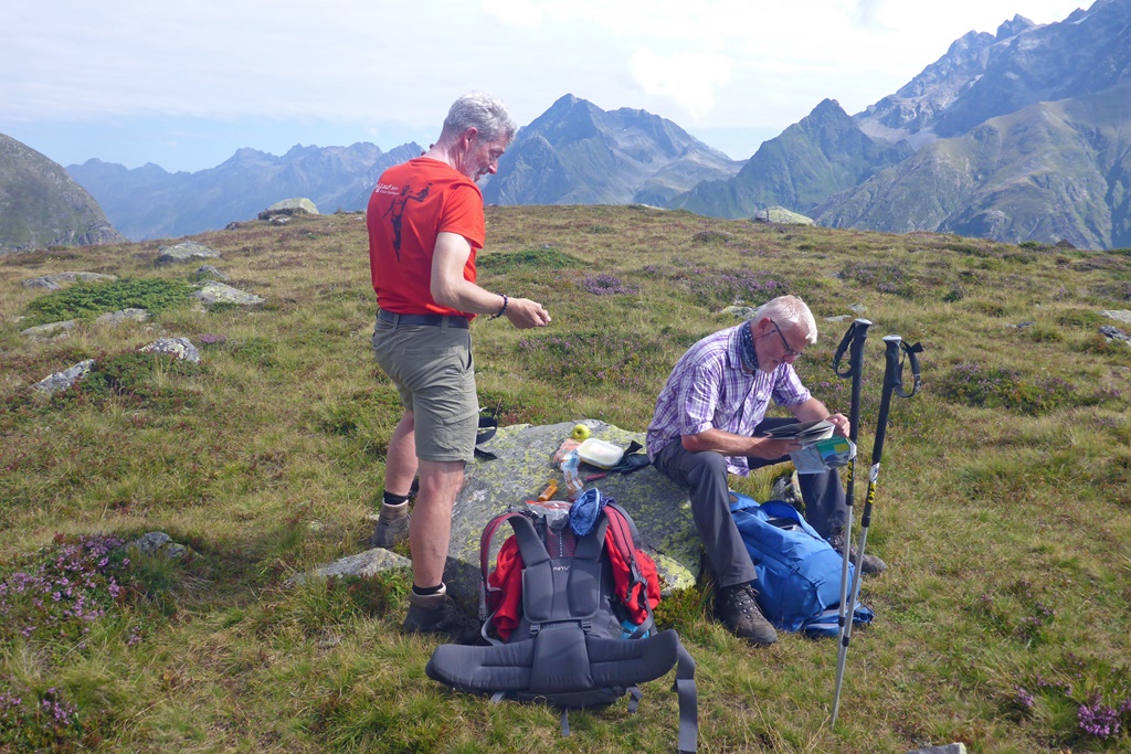 Vormittags liefen wir entspannt (ohne Rucksack) in Richtung Steinbockjoch um anschließend auf die Parstleswand zu steigen. Leider zogen die Wolken immer tiefer und es war auch Regen voraus gesagt. So haben wir mitten im Aufstieg abgebrochen. Der Weg ist nicht gekennzeichnet, aber durch Steinmännchen ganz gut gekennzeichnet.