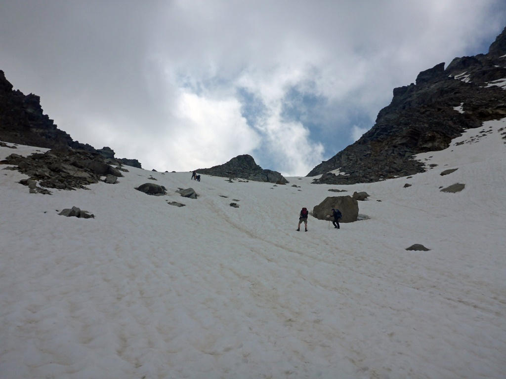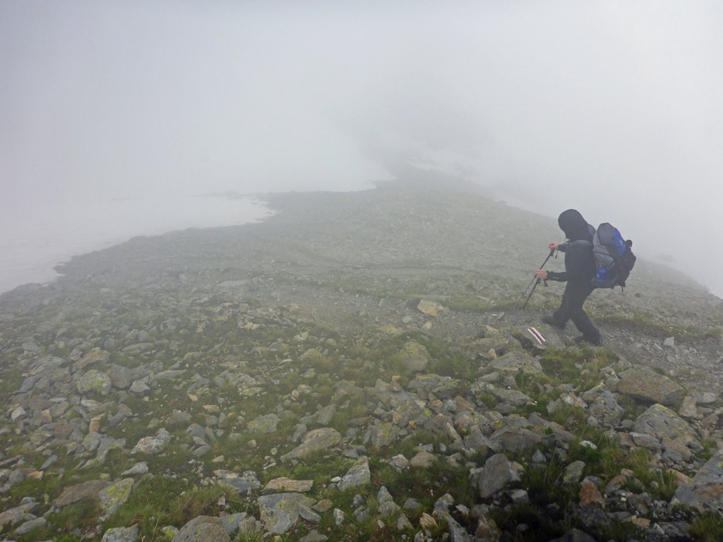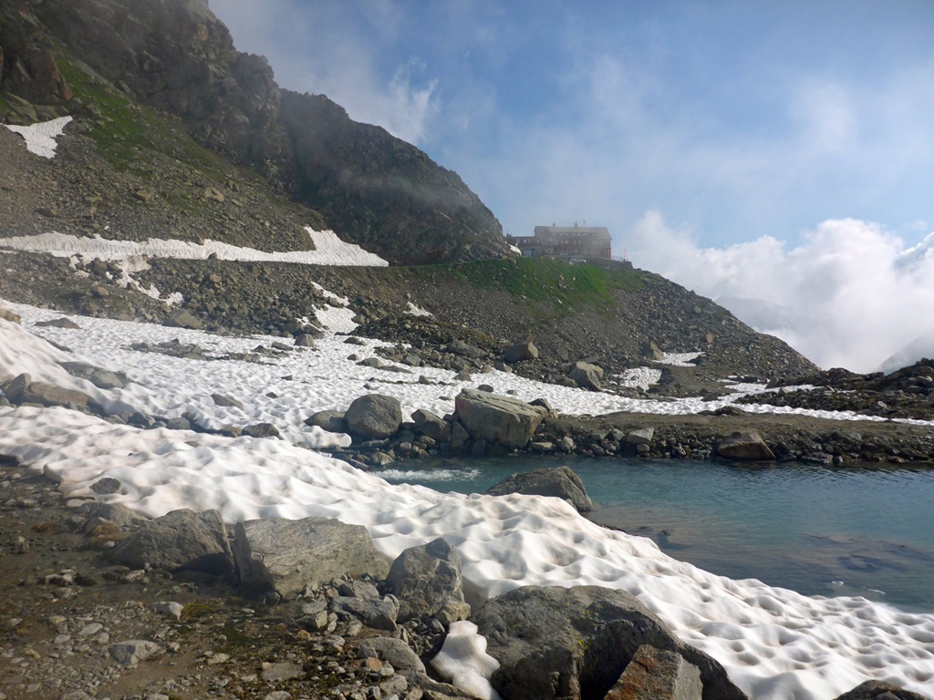 Oben angekommen geht Moni alleine auf den Gipfel der westlichen Plattenspitze. Michael erkundet den Pass und die Schutzhütte und Tim versucht den weiteren Weg auszukundschaften, da der Weg über die Kromer Lücke nicht mehr begehbar ist. Also steigen wir wieder ab, queren den Hang um zur Seelücke wieder aufzusteigen. Hier gibt es eine kleine Zollhütte (Günthers Wohnzimmer). Unser heutiges Ziel ist bereits zu sehen. Aber auch die Wolken, die heraufziehen. Im Blindgang mit teilweise nur 20m Sicht steigen wir durch steile Schneefelder ab in Richtung Saarbrücker Hütte. Gut das wir die Richtung ungefähr wussten. Ein Tag mit 80% Schnee.