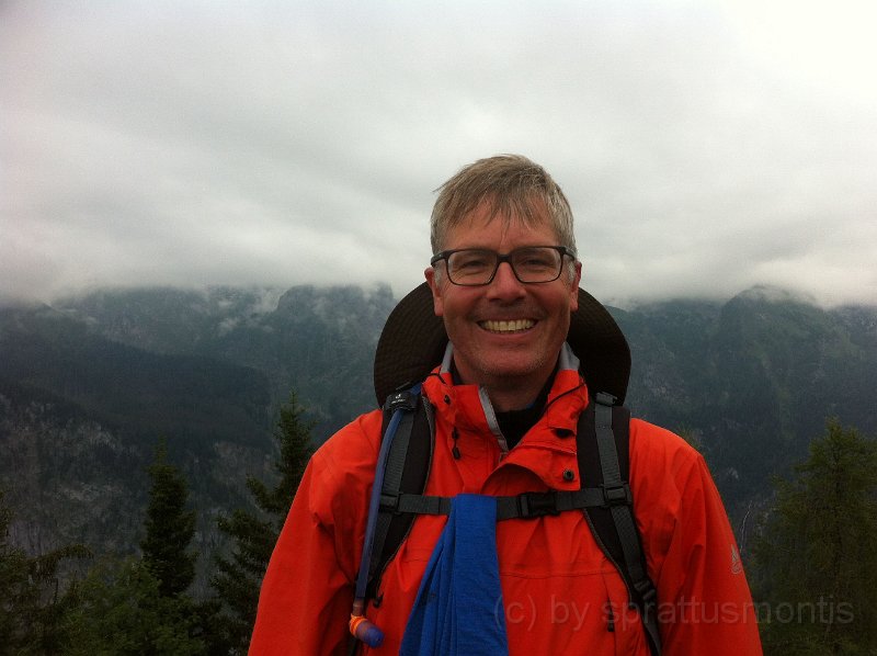 Die Sonne hat uns verlassen. Auf nassen Wegen geht es parallel zum Ober- und Königssee. Vom Halsköpfel 1719 m, können wir über den Königssee sehen, und wir haben Handykontakt.